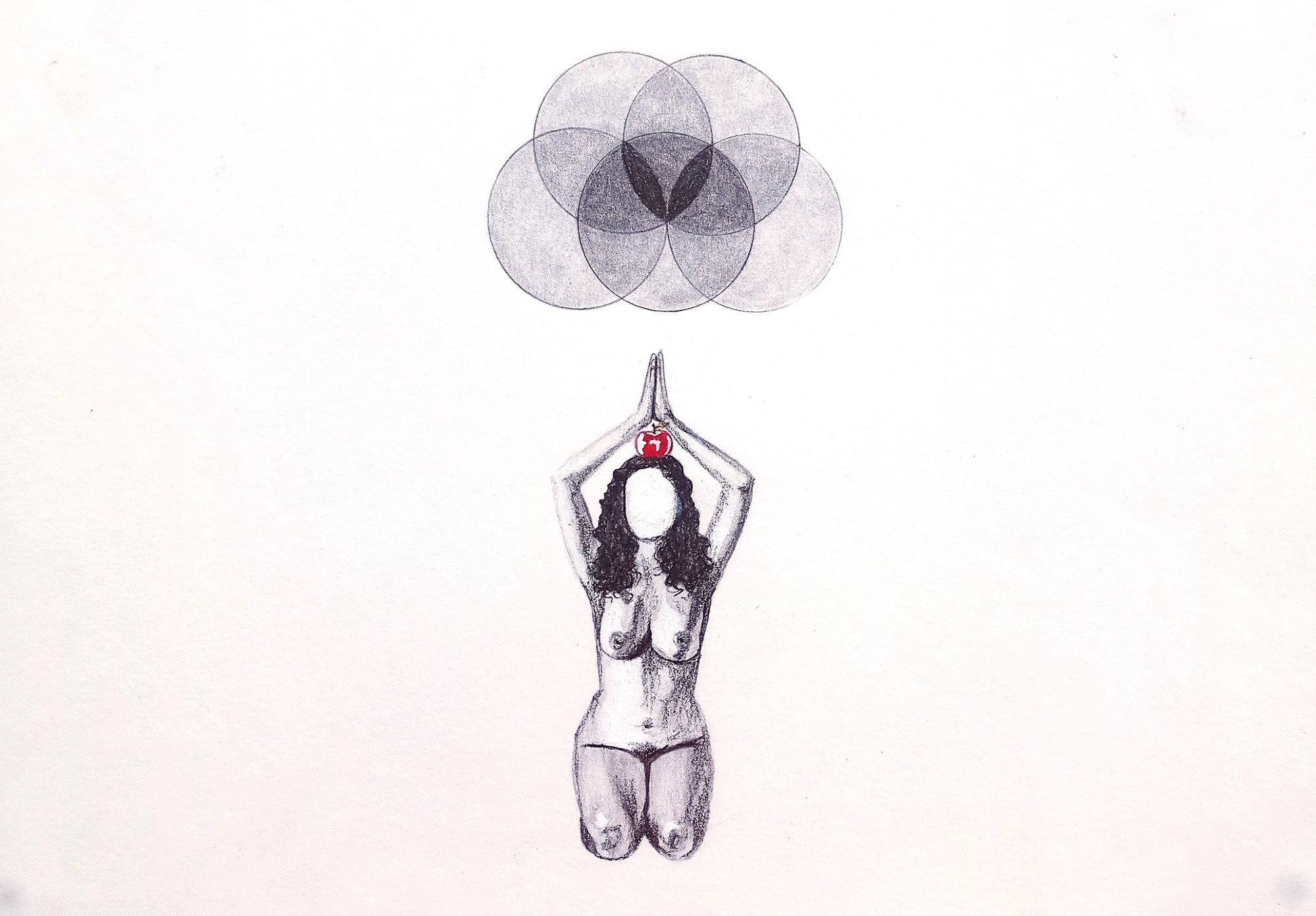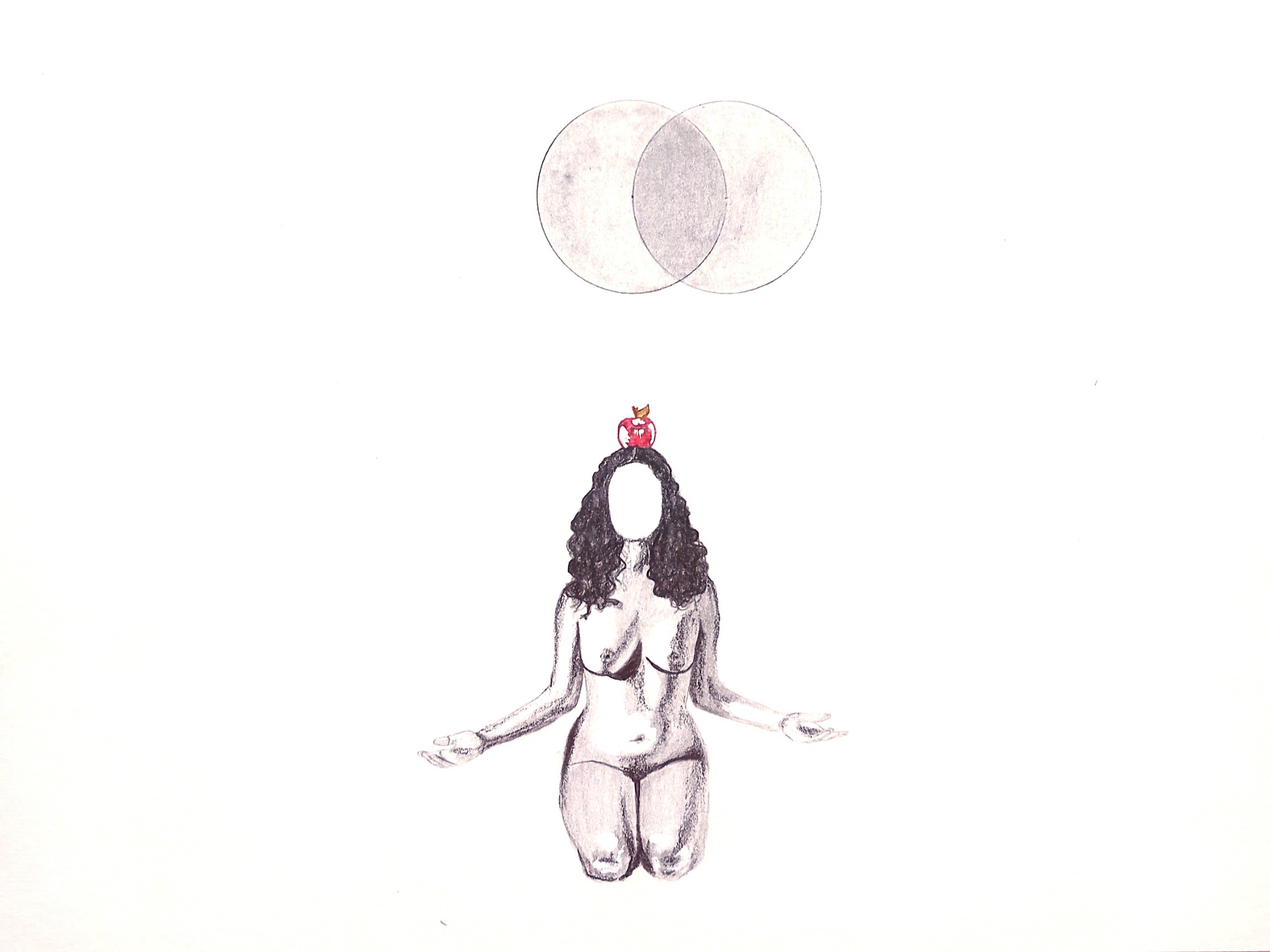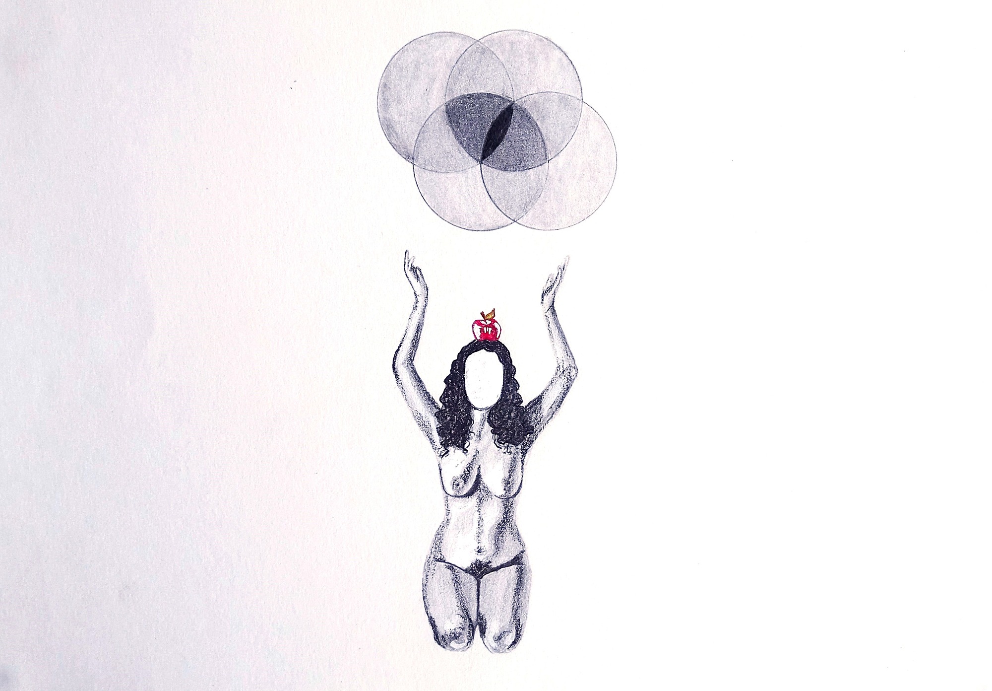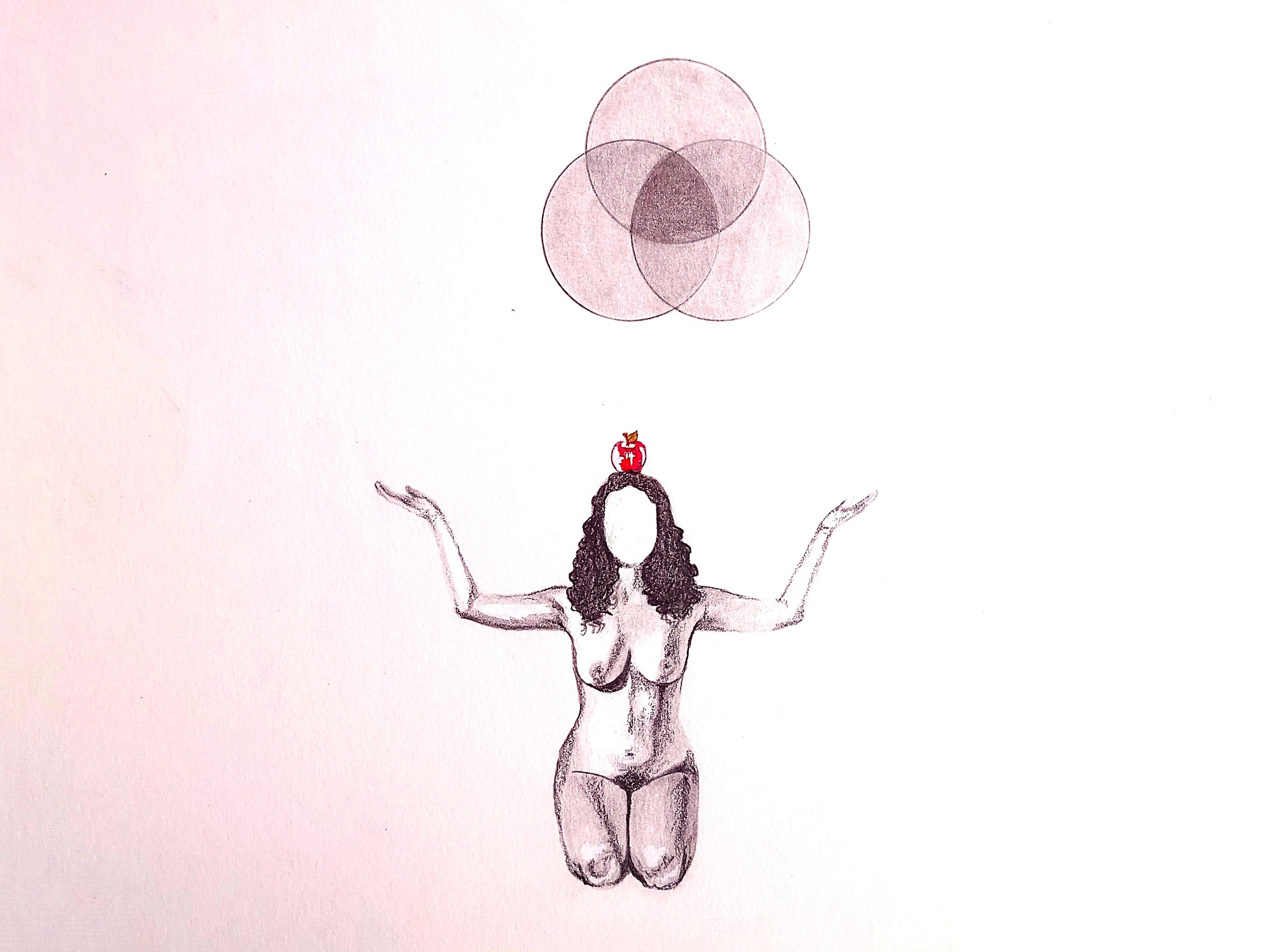 This series explores female embodiment, spiritual awakening, and the burden of inherited meaning. A faceless nude figure kneels beneath evolving circular forms, evoking sacred geometry or stages of consciousness. The red apple atop her head suggests themes of knowledge, temptation, and pathologized femininity. As her arms slowly rise, she moves from silence to self-possession, transforming archetypal symbols into a quiet act of resistance and reclamation.