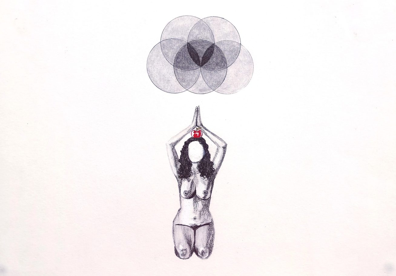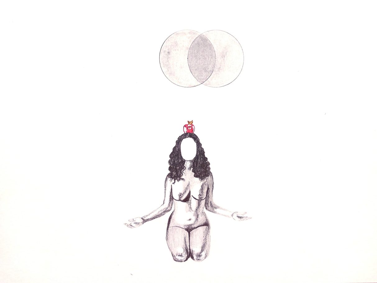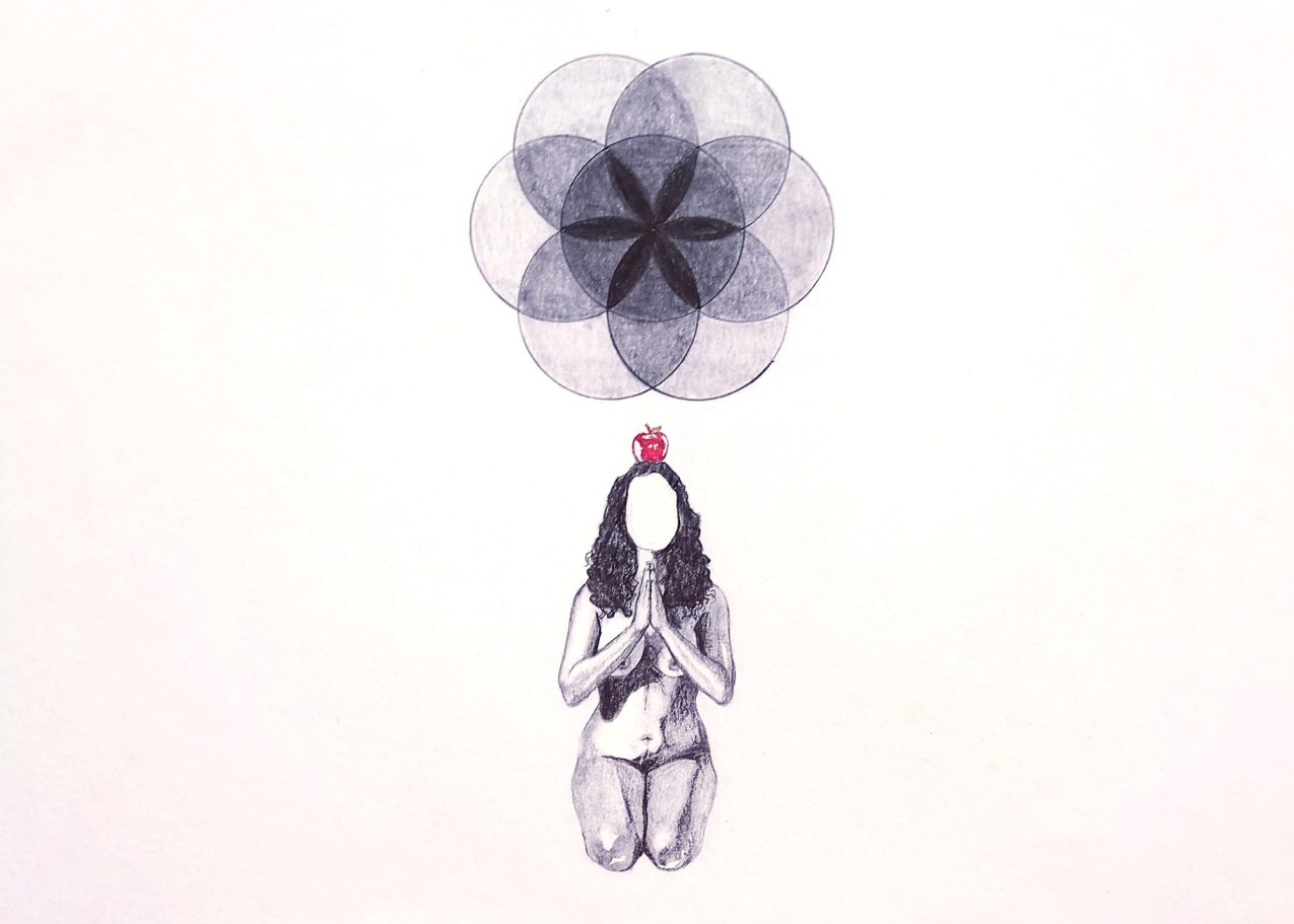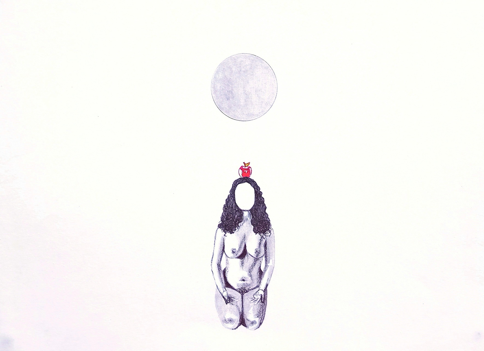 This series explores female embodiment, spiritual awakening, and the burden of inherited meaning. A faceless nude figure kneels beneath evolving circular forms, evoking sacred geometry or stages of consciousness. The red apple atop her head suggests themes of knowledge, temptation, and pathologized femininity. As her arms slowly rise, she moves from silence to self-possession, transforming archetypal symbols into a quiet act of resistance and reclamation.