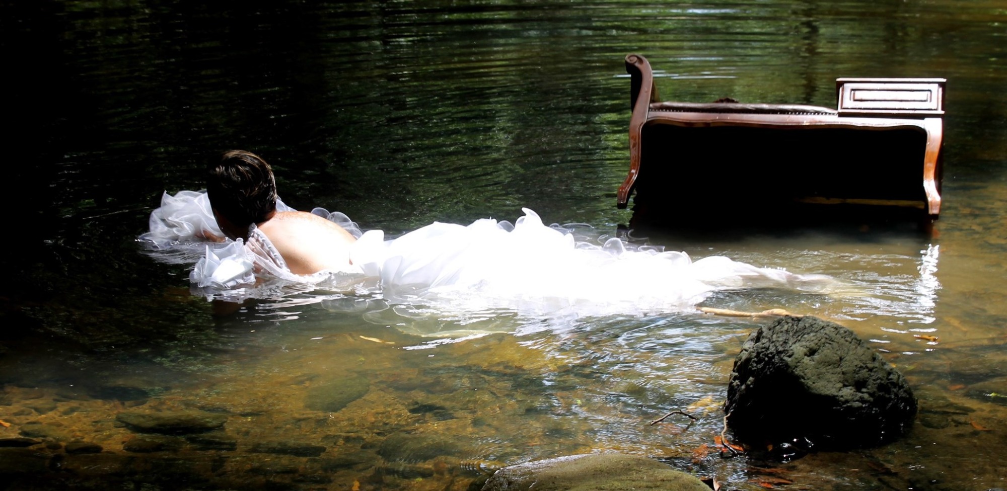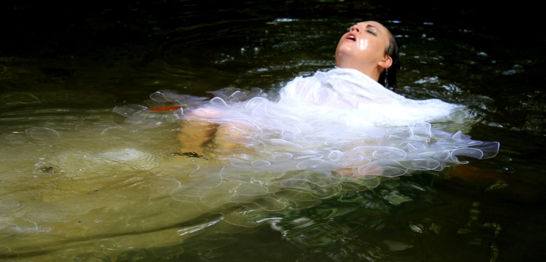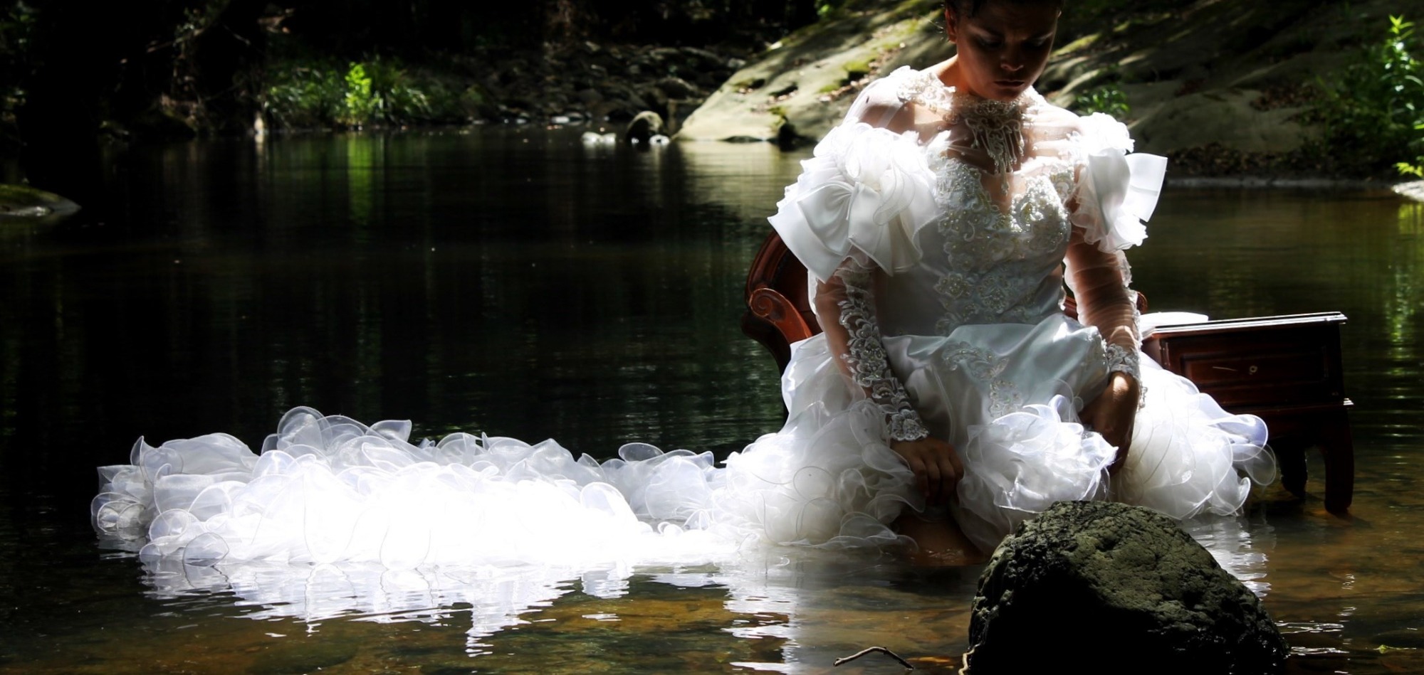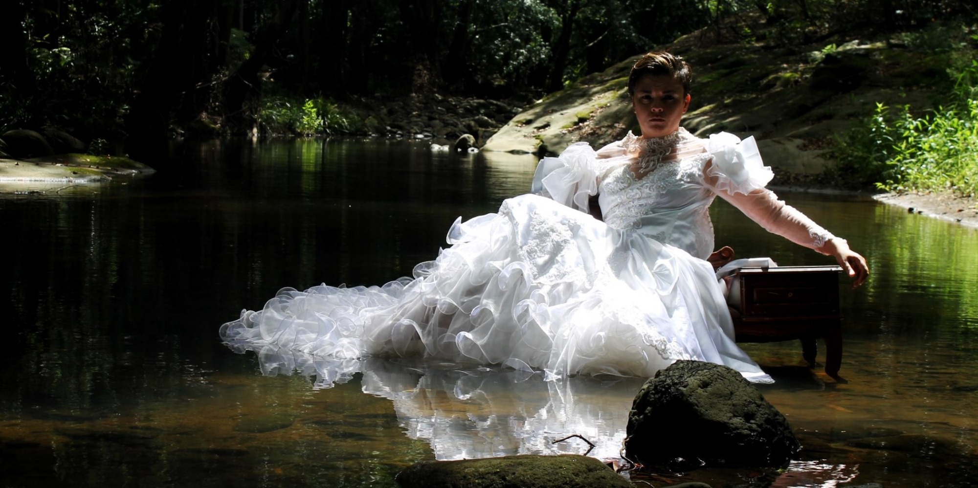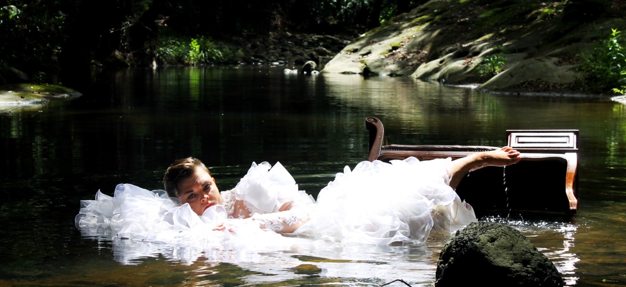 This work was created in collaboration with fellow artist Alana Grant, under our collective name Fox-Y. Alana took the photos of me, providing the costumes and location. In this photographic series, I move through a sequence of stillness, unravelling, and submersion. Dressed in white and immersed in nature, I enact a ritual shaped by mourning, madness, and surrender. The dress carries the weight of roles inscribed on women’s bodies, such as bride, patient, sacrifice - while the natural setting becomes a space of both dissolution and refuge.