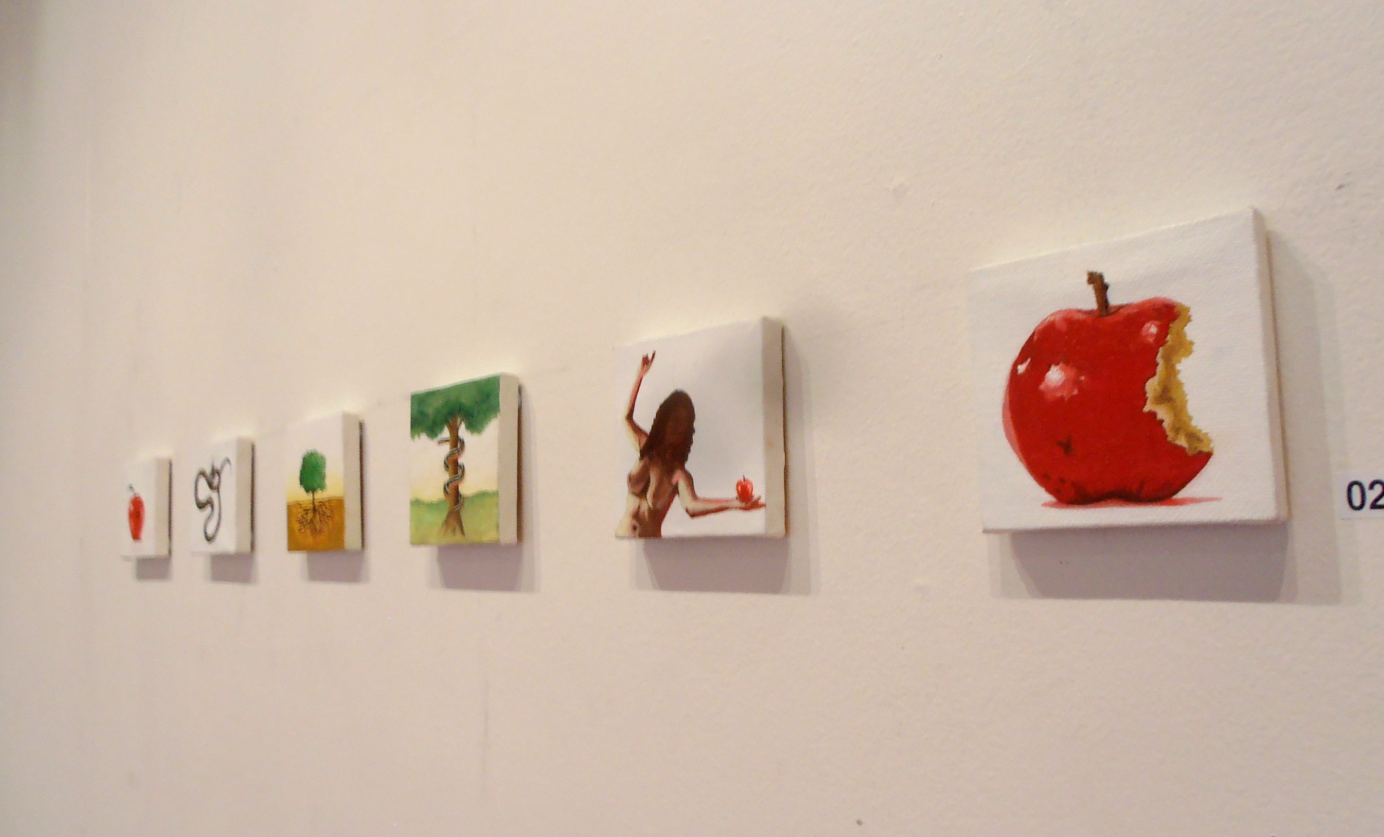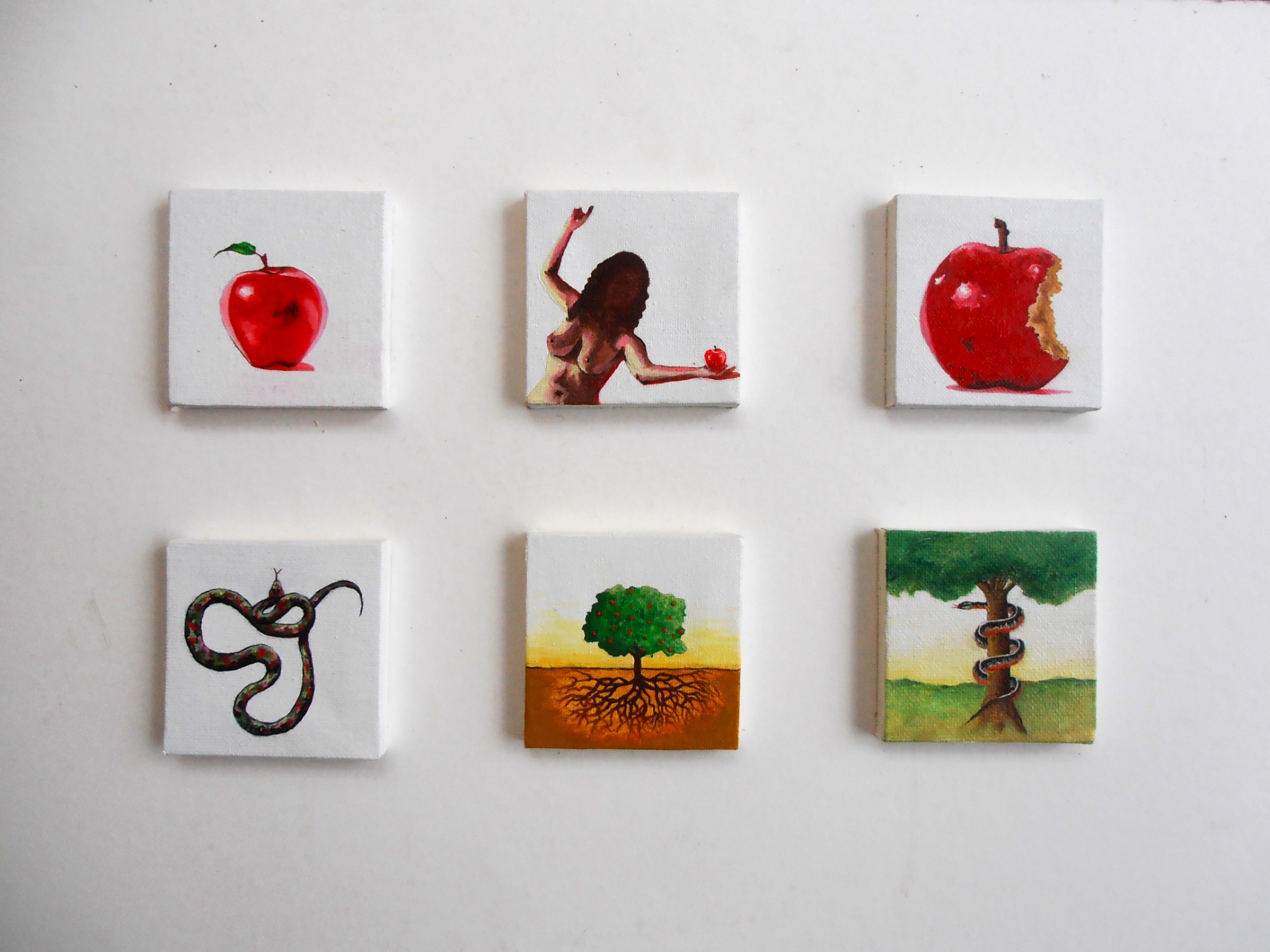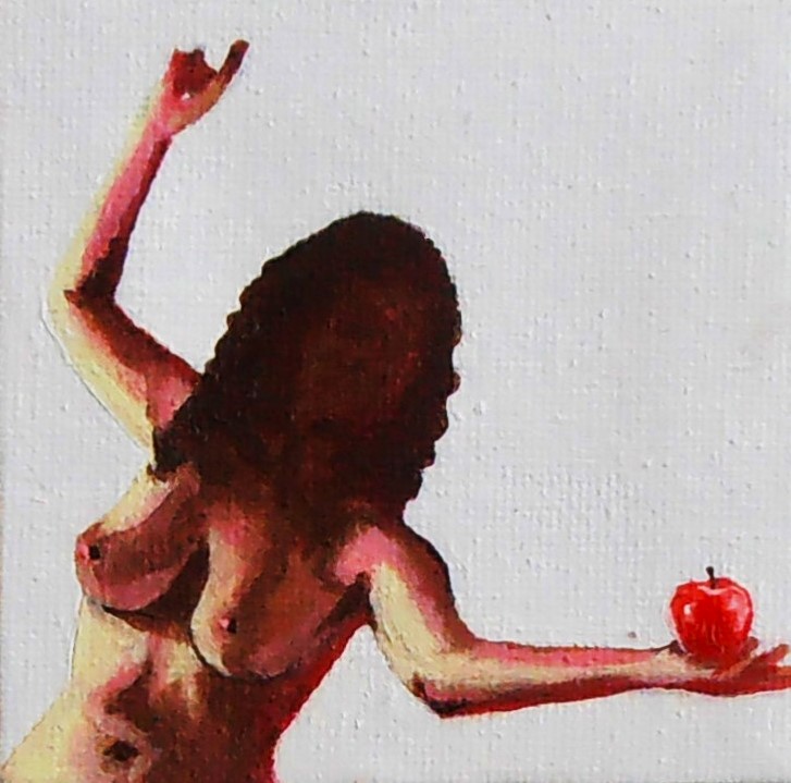 Explores the symbolic power of the apple, the serpent, and the female figure. Drawing from myth, theology, and lived experience, these small paintings challenge cultural narratives of shame, temptation, and control placed on women’s bodies. Through visual fragments, bite marks, bare skin, and entangled roots, I reframe the so-called ‘original sin’ as a story of agency, hunger, and reclamation. These works are intimate testimonies to the complexity of womanhood, the cost of knowledge, and the deep, tangled roots of self-worth.